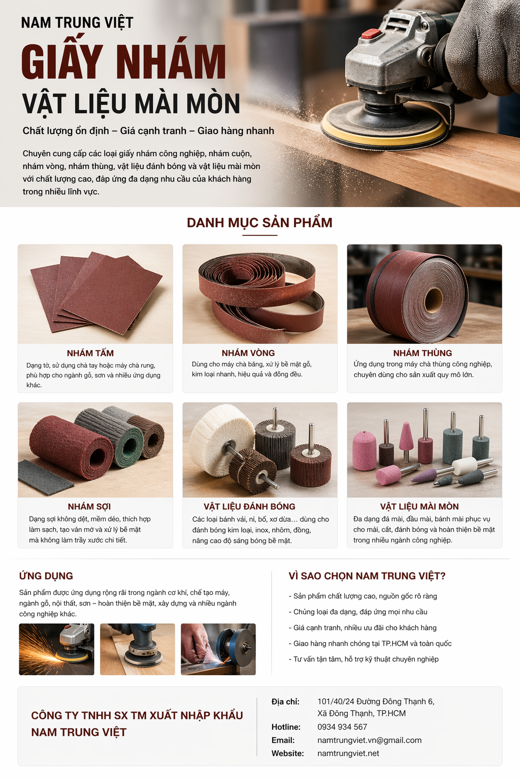 Công ty TNHH SX TM Xuất Nhập Khẩu Nam Trung Việt là đơn vị chuyên cung cấp các loại giấy nhám và vật liệu đánh bóng, đáp ứng đa dạng nhu cầu từ thủ công đến công nghiệp.